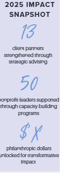Thank you for being part of this community of changemakers. Your partnership continues to inspire us as we look ahead to 2026—with a renewed commitment to unlocking more capital, strengthening organizational capacity, and building a more connected, resilient social impact ecosystem.