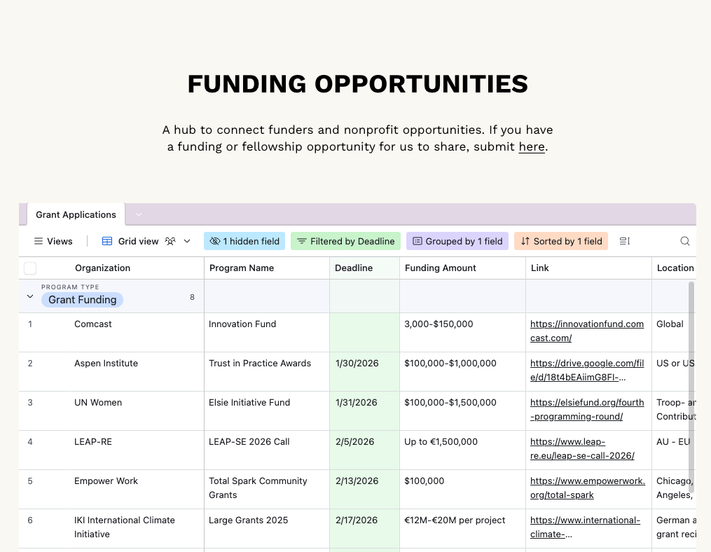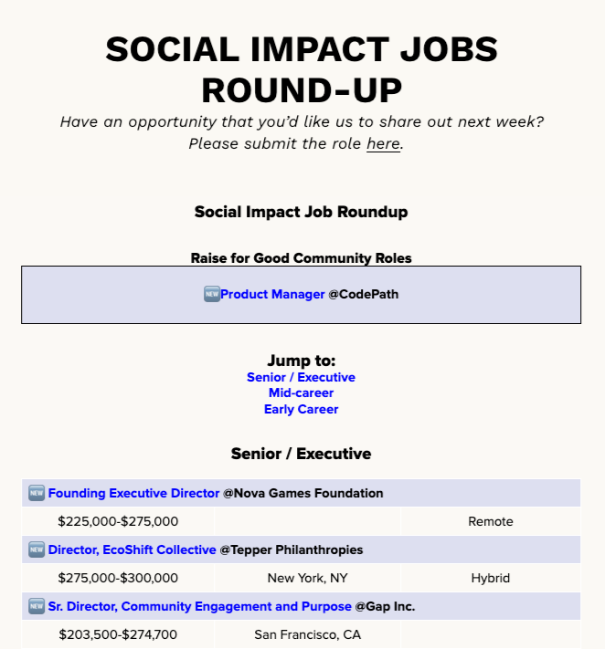 We provide timely resources at the intersection of nonprofits and funders. From virtual community panels convening leaders around emerging topics, to curated funding and career opportunity roundups, these resources expand access and strengthen the social impact ecosystem.